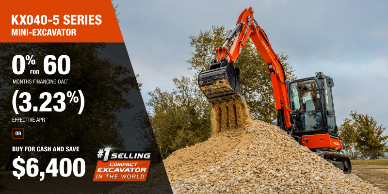 Representative finance example for the KX040-5: $91,349.26 financed at 0% (3.23% effective APR which factors in $6,400.00 in non stackable cash that cannot be combined with finance offers) equals $1370.9 monthly for 60 months. $9,139.32 down payment required. Cost of borrowing is $6,400.00 for a total obligation of $91,349.26. Financing available on approved credit. Prices and payments include freight and other applicable fees (including environmental fees, administration fees, set-up fees, and dealer fees on the model specified). Excavator Claim: "Kubota is the world’s #1 selling compact excavator for 20 years." Disclaimer: According to 2023 data from Off-Highway Research including all Kubota Group brand sales. Offer valid until 06-30-2026.