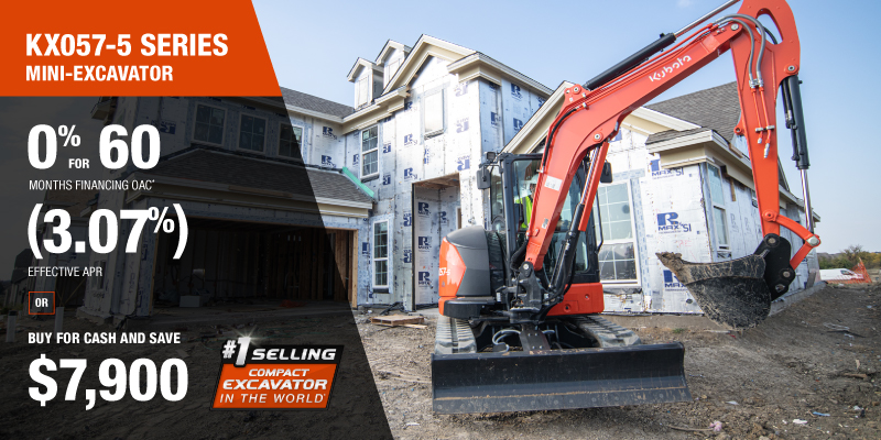 Representative finance example for the KX057-5: $118,641.26 financed at 0% (3.07% effective APR which factors in $7,900.00 in non stackable cash that cannot be combined with finance offers) equals $1780.48 monthly for 60 months. $11,869.84 down payment required. Cost of borrowing is $7,900.00 for a total obligation of $118,641.26. Financing available on approved credit. Prices and payments include freight and other applicable fees (including environmental fees, administration fees, set-up fees, and dealer fees on the model specified). Excavator Claim: "Kubota is the world’s #1 selling compact excavator for 20 years." Disclaimer: According to 2023 data from Off-Highway Research including all Kubota Group brand sales. Offer valid until 06-30-2026.