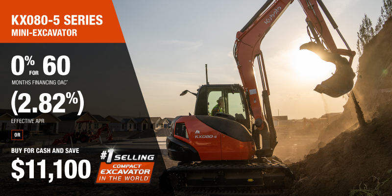 Representative finance example for the KX080-5: $180,598.10 financed at 0% (2.82% effective APR which factors in $11,100.00 in non stackable cash that cannot be combined with finance offers) equals $2710.28 monthly for 60 months. $18,068.53 down payment required. Cost of borrowing is $11,100.00 for a total obligation of $180,598.10. Financing available on approved credit. Prices and payments include freight and other applicable fees (including environmental fees, administration fees, set-up fees, and dealer fees on the model specified). Excavator Claim: "Kubota is the world’s #1 selling compact excavator for 20 years." Disclaimer: According to 2023 data from Off-Highway Research including all Kubota Group brand sales. Offer valid until 06-30-2026.