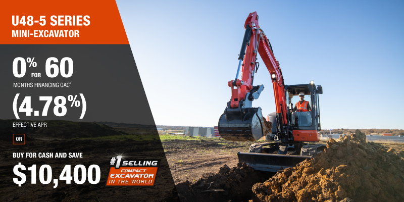 Representative finance example for the U48-5: $102,953.69 financed at 0% (4.78% effective APR which factors in $10,400.00 in non stackable cash that cannot be combined with finance offers) equals $1545.05 monthly for 60 months. $10,300.32 down payment required. Cost of borrowing is $10,400.00 for a total obligation of $102,953.69. Financing available on approved credit. Prices and payments include freight and other applicable fees (including environmental fees, administration fees, set-up fees, and dealer fees on the model specified). Excavator Claim: "Kubota is the world’s #1 selling compact excavator for 20 years." Disclaimer: According to 2023 data from Off-Highway Research including all Kubota Group brand sales. Offer valid until 06-30-2026.